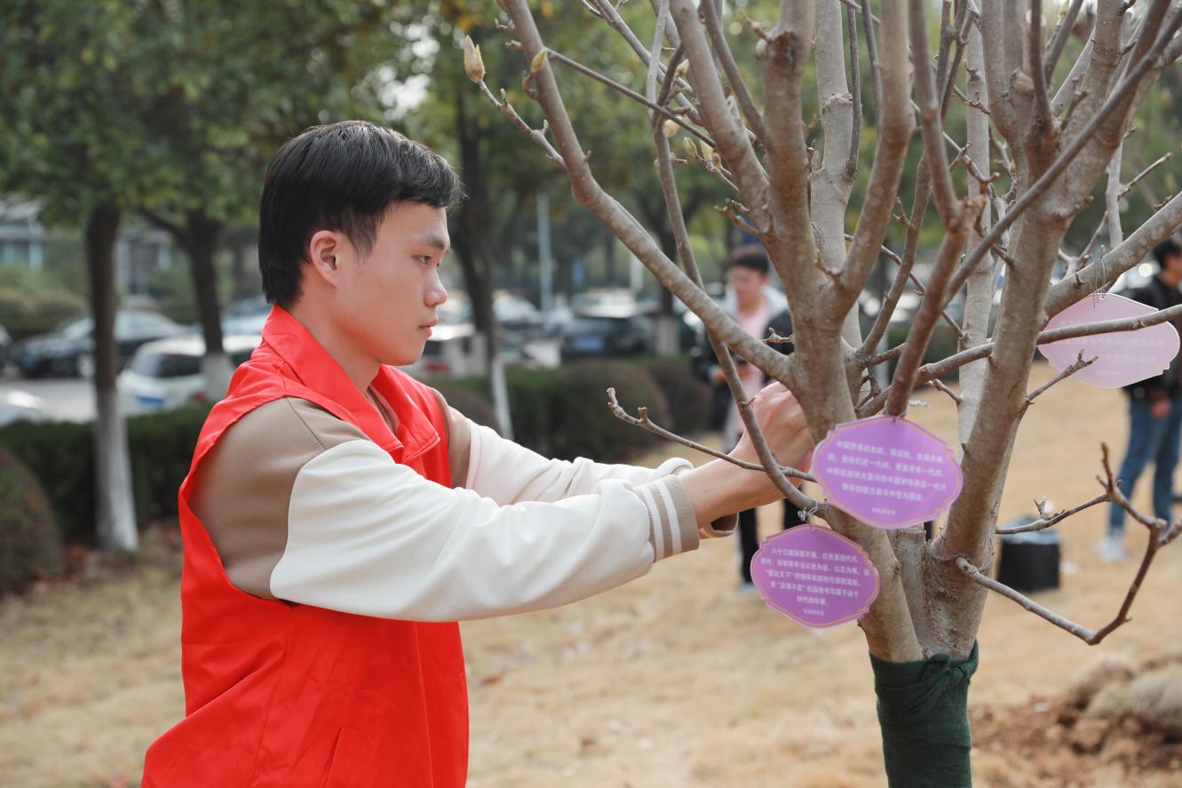 伴随着深情而激昂的合唱歌声,校领导与共建单位党员们三两成组,领取工具、栽植树苗。大家分工协作,俯身挖坑、扶苗填土、提桶浇灌,为玉兰树系上刻有励志寄语色标识牌。每一个动作都细致入微,每一道工序都井然有序,在欢声笑语中,一棵棵紫玉兰树苗稳稳地在南邮校园“安家”,“党建共建先锋林”落地生根,为这片土地注入了新的生机与希望。