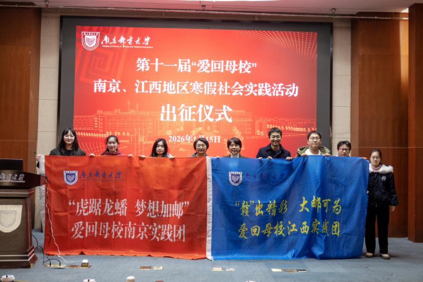 岁聿云暮,暖潮涌动。1月15日,南京邮电大学物联网学院第十一届“爱回母校”寒假社会实践活动出征仪式正式启动。学院党委书记邓艳华,党委副书记、副院长邓艳,熊师洵、顾君怡等老师莅临指导,南京、江西两地实践团学生代表共同参与。本次活动旨在引导南邮学子重返高中母校,在传递感恩、分享成长的同时,讲好南邮故事、播撒奋斗希望,为2026届高考学子注入奋进力量,于辞旧迎新之际,绘就一幅校地联动、薪火相传的青春画卷。