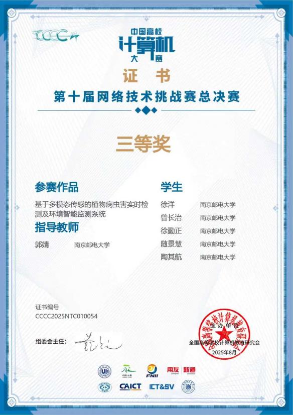 1 | 基于多模态传感的植物病虫害实时检测及环境智能监测系统 | 徐洋、曾长治、徐勤正、随景慧、陶其航 | 国赛三等奖 | 郭婧 |