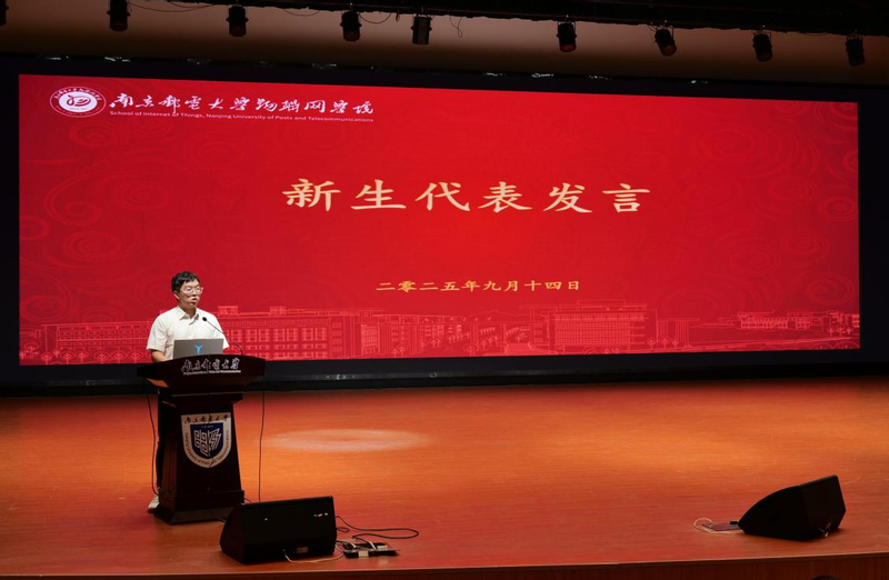 2025级测绘工程专业的张瑞泽代表新生发言。他向学院领导、老师以及学长学姐们表达了由衷的感谢,并畅谈了对大学生活的期待与憧憬。张瑞泽表示,他期待在南邮这片知识与梦想交织的沃土上,扎根学习,茁壮成长。